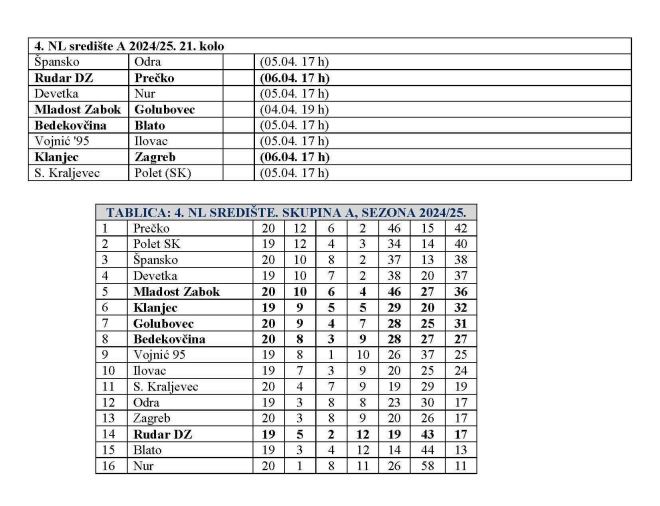 Pred nama je 21. kolo 4. NL središte – skupina A. Kako stvari stoje sa vremenom, ovo bi kolo trebalo proći bez problema, za razliku od 20. kola, u kojem su četiri utakmice odgođene. Jedna je u međuvremenu odigrana jučer. U Zagorskom derbiju Golubovec je svladao Bedekovčinu sa 3:1.