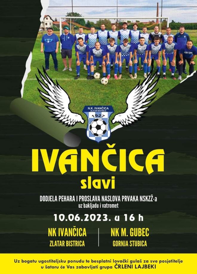 NK Ivančica Zlatar Bistrica poziva na završnu prvenstvenu utakmicu seniora protiv NK Matija Gubec Gornja Stubica u subotu, 10. lipnja u 16 sati na nogometnom igralištu u Zlatar Bistrici. Nakon utakmice bit će upriličena dodjela pehara i proslava prvog mjesta NK Ivančice u 1. ŽNL, nakon 42 godine. Ivančica časti sve navijače i posjetitelje lovačkim gulašem; nastupaju Zlatarbistričke mažoretkinje, priprema se veliki vatromet i živa svirka sastava Črleni lajbeki.