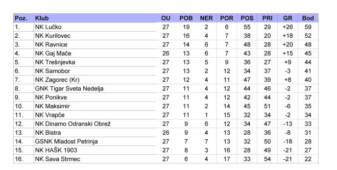 ZAGOREC KR: Sinković, Presečki (68' Cigula), Štimac, Stiperski, Topolovec (46' Ružak), Turniški, Landripet, Kesse, Bračević, Jazbec, Erlić (46' Ferčec). TRENER: Perica Vidak