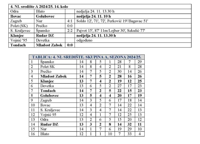 Danas su odigrane četiri utakmice 14. kola 4. NL središte skupina A, a na rasporedu je bio jedan zagorski derbi. Tondach i Mladost Zabok u Bedekovčini su odigrali bez golova. Utakmicu je obilježila sjajna obrana kaznenog udarca golmana Mladosti Zorana Mihovilića, koji je obranio penal, koji je izveo Vito Suljić. Kolo su još prijepodne otvorili Zagreb i Nur, slavio je Zagreb sa 4:1, a u poslijepodnevnom terminu sve su utakmice završile bez pobjednika. Polet (SK) i Prečko igrali su 0:0, a Sesvetski Kraljevec i Špansko 2:2. To znači da su četiri vodeće ekipe remizirale. Špansko je ostalo u vodstvu sa 29 bodova, Polet (SK) ima 28, a Prečko i Mladost Zabok po 26. Klanjec je peti sa 25 bodova, i može se sutra primaknuti na bod Španskom, ako dobije još jedan zagorski derbi, kod kuće protiv Klanjca. Golubovec će pak sutra u 10 sati igrati kod Ilovca, a u 13.30 sati igraju još Odra i Blato. Utakmica Vojnić '95 – Devetka je odgođena.