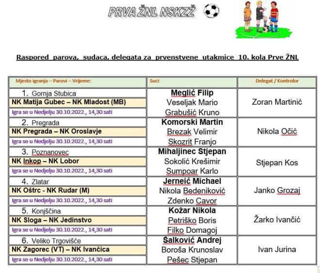 Pred nama je 10. kolo u 1. i 2. zagorskoj nogometnoj ligi. U 10. kolu 1. zagorske lige vodeće Jedinstvo gostuje kod Sloge i traži novu pobjedu kako bi u zadnjem kolu pred pauzu na svom igralištu moglo osigurati jesenski naslov. Oštrc, koji zaostaje dva boda dočekuje Rudar M. Pregrada će biti domaćin Oroslavju, a Ivančica gostuje kod Zagorca VT. Na papiru vodeća četvorka bi trebala do novih bodova, no vidjet ćemo hoće li baš svi proći neokrznuti. Derbi začelja i susjeda igra se u Gornjoj Stubici, gdje Matija Gubec dočekuje Mladost MB, a Inkop će u Poznanovcu biti domaćin Loboru. Utakmice se igraju danas u 14.30 sati.