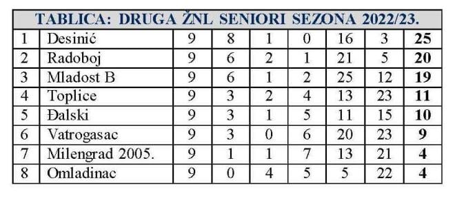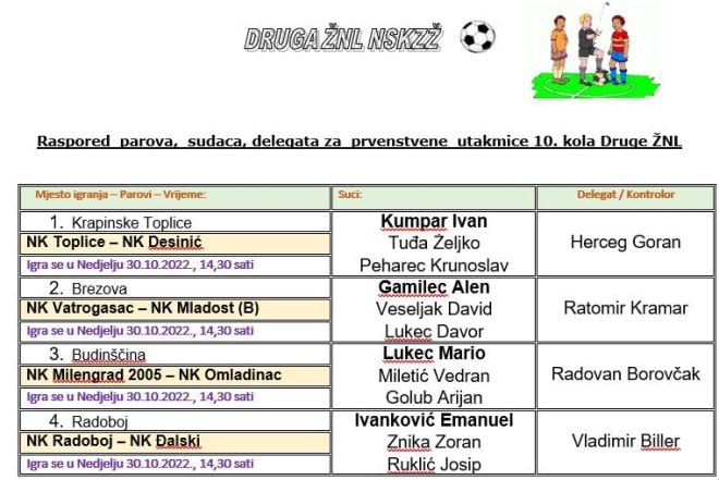 U 10. kolu 2. zagorske lige vodeći Desinić gostuje kod Toplica. Ako pobijedi kolo prije kraja osigurat će jesenski naslov. Radoboj dočekuje Đalski, Mladost B će u goste Vatrogascu, a derbi začelja u Budinščini igraju Milengrad 2005. i Omladinac. Utakmice se igraju također danas u 14.30 sati.
