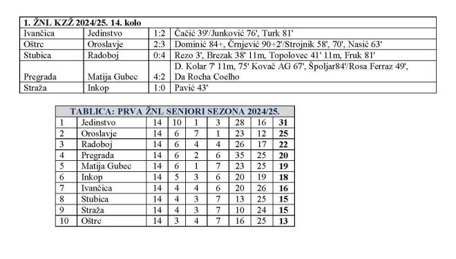 Krenuo je proljetni dio 1. zagorske nogometne lige. Podsjetimo, liga deset i ove sezone donosi trokružni sustav. To znači da ukupno imamo 27 kola, a 13 ih je odigrano u jesenskom dijelu. Već u prvom proljetnom kolu puno zanimljivosti. Vodeće Jedinstvo je preokretom u Zlatar Bistrici stiglo do 2:1 i ostalo je na vrhu sa 31 bodom. Oroslavje se zadržalo na drugom mjestu sa šest bodova zaostatka, nakon 3:2 pobjede kod Oštrca. I treći Radoboj je slavio i to sa 4:0 kod Stubice i ima sada 22 boda. Pregrada je pobjedom 4:2 protiv Matije Gupca, nakon dva preokreta stigla na četvrto mjesto sa 20 bodova. Slijede Matija Gubec sa 19, Inkop sa 18, Ivančica sa 16 i Stubica sa 15 bodova. Straža je stigla do važne pobjede, 1:0 protiv Inkopa, pa sada ima 15 bodova i preskočila je Oštrc, koji je sada zadnji, deseti sa 13 bodova. U 15. kolu na rasporedu je veliki derbi, utakmica u kojoj drugo Oroslavje dočekuje vodeće Jedinstvo. Na rasporedu je i vječni stubički derbi u kojem Matija Gubec dočekuje Stubicu. Straža će u drugoj uzastopnoj domaćoj utakmici dočekati Ivančicu, a Inkop je domaćin Pregradi. Radoboj dočekuje Oštrc, a sve se utakmice igraju u nedjelju 23. ožujka u 15.30 sati.
