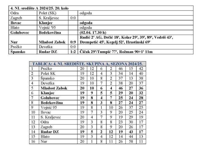 Vrijeme je jako krojilo 20. kolo 4. NL središte – skupina A. Još je u petak vodeće Prečko u derbiju sa Devetkom igralo 0:0. Isti rezultat bio je i u subotu prije podne u utakmici Zagreba i Sesvetskog Kraljevca. A u subotu poslijepodne stigle su super vijesti za zagorski i zabočki nogomet. Od Mladosti iz Zaboka svi su očekivali pobjedu kod zadnjeg Nura, ali malo tko je vjerovao u ovakvu uvjerljivost, jer Mladost je slavila sa čak 9:0. No, još je veća pobjeda Rudara DZ, koji se bori za opstanak, a u subotu je u gostima sa 2:1, nakon preokreta, slavio protiv Španskog, koje se bori za naslov. Koliko je to velika pobjeda govori podatak da je ovo tek drugi poraz Španskog u cijeloj sezoni. Zagorski derbi u ovom kolu Golubovec – Bedekovčina je pomaknut za srijedu 2. travnja u 17.30 sati, dok je u nedjelju stigla vijest da je i utakmica Klanjca kod Ilovca odgođena. Utakmice Odra – Polet (SK) i Blato – Vojnić '95' također su odgođene, bez novog termina igranja zasada. Ovom se pobjedom Mladost Zabok malo približila vodećoj četvorki, iako ima tu i još neodigranih utakmica, ali situacija je bolja. Također, Rudar DZ je i dalje na 14. mjestu, ali sada sa 17 bodova, koliko imaju i Odra i Zagreb, a nije daleko ni Sesvetski Kraljevec. I 21. kolo donosi jedan zagorski derbi. Već petak od 19 sati u Zaboku Mladost će dočekati Golubovec. Bedekovčina će u subotu dočekati Blato, koje se diglo u proljeće pa neće biti lagano. Rudar DZ će imati još jedan težak izazov, jer u nedjelju u 17 sati dočekuje Prečko, dok će Klanjec u isto vrijeme biti domaćin Zagrebu. Špansko dočekuje Odru, Devetka Nur, Vojnić '95 Ilovac, a Sesvetski Kraljevec je domaćin Poletu (SK).
