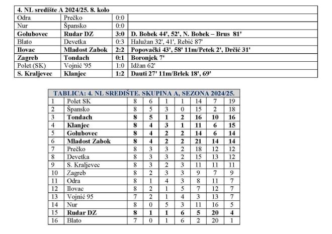 Odigrano je 8. kolo 4. NL središte skupina A. U zagorskom derbiju, u subotu Golubovec je sa 3:0 svladao Rudar DZ. Subota je donijela i dvije sjajne pobjede u gostima zagorskih klubova. Tondach je sa 1:0 slavio kod Zagreba, dok je Klanjec sa 2:1 pobijedio u Sesvetskom Kraljevcu. Malo je dojam pokvarila Mladost Zabok, koja je u nedjelju prokockala 2:0 kod Ilovca. Završilo je 2:2. Vodstvo na ljestvici je opet preuzeo Polet (SK) koji je sa 1:0 pobijedio Vojnić '95', dok je Špansko kod Nura odigralo bez golova. Špansko na drugom mjestu ima 18 bodova, a potom slijedi zagorska četvorka, od trećeg do šestog mjesta. Tondach ima 16, Klanjec 15, a Golubovec i Mladost Zabok po 14 bodova. Peti zagorski predstavnik Rudar DZ je na predzadnjem mjestu sa četiri boda. U 9. kolu nema zagorskih derbija. Jedini će u goste Golubovec i to na teško, ali i izazovno gostovanje kod Španskog. Tondach također ima utakmicu protiv ekipe iz vrha, dakle još jedan derbi, doma protiv vodećeg Poleta (SK). Kod kuće igra i Zabok koji dočekuje Zagreb, kao i Rudar DZ, koji je domaćin Blatu u važnoj utakmici za bijeg sa dna. Sve se te utakmice igraju u subotu 19. listopada u 15.30 sati. Kolo će u nedjelju završiti Klanjec, koji također u 15.30 sati dočekuje Odru. Inače, kolo već u petak otvaraju Prečko i Nur, a u subotu još igraju: Vojnić '95 – Sesvetski Kraljevec i Devetka – Ilovac.
