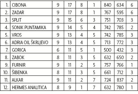TRICA: Šibenka: 11/25 (44%) (Širko 3, Šarić 3, Andabaka 2, Freeman, Bašić, Miković); Zabok: 7/19 (36%) (Anzulović 3, Tomas, P. Marić, Črnjević, Lisica)