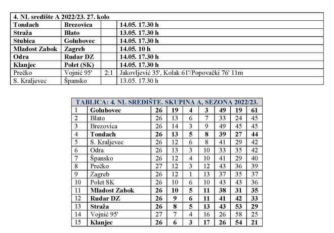 Nakon što je u srijedu i službeno potvrđeno da Zagorje ima prvaka 4. NL središte skupina A, 27. kolo je već krenulo jučer, kada je Prečko dočekalo Vojnić '95' i pobijedilo 2:1. Važna je to utakmica i za zagorsku dvojku koja se bori za opstanak, Stubicu i Klanjec, jer još uvijek postoji nada da barem jedna od ove dvije zagorske ekipe može preko Vojnića '95 do opstanka. Klanjec zaostaje četiri, a Stubica šest bodova. I jedni i drugi imaju sutra domaće utakmice, ali nimalo lagane. Klanjec dočekuje Polet (SK) i za nadu, pred gostovanje baš kod Vojnića '95 treba pobjedu. Stubica ima najteži mogući zadatak, jer čeka novog prvaka, Golubovec. Sutra će igrati i Tondach, koji dočekuje Brezovicu u izravnoj borbi za drugo mjesto, Rudar DZ koji gostuje kod Odre, te još ujutro Mladost Zabok, koja je domaćin Zagrebu. Danas će na teren od zagorskih predstavnika samo Straža, koja dočekuje Blato.