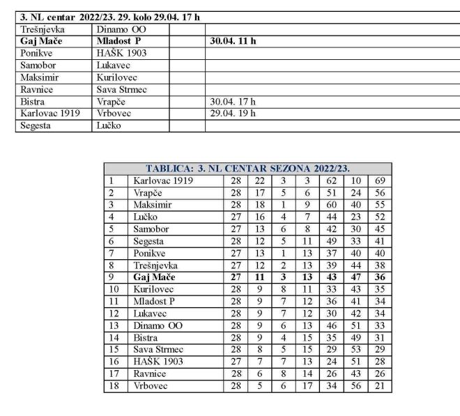 Gaj Mače će pak na teren sutra, u svom uobičajenom terminu u 11 sati dočekuje Mladost Petrinja i traži pobjedu, nakon dva uzastopna poraza, prošle nedjelje doma od Dinama (OO) i u srijedu kod Trešnjevke. Evi i ostalih parova i ljestvice. Većina se utakmica igra danas.