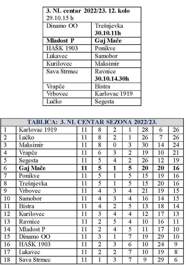 Gaj Mače je krizu izgleda prebrodio i to sa tri uzastopne pobjede. Novu će ganjati sutra u 15 sati kod Mladosti u Petrinji. Danas se igra većina utakmica 3. NL centar, samo će dvije ostati za sutra.