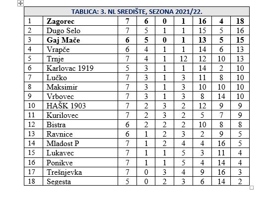 Jučer je odigrano 7 utakmica 7. kola 3. HNL središte, a zagorski su predstavnici stigli do novih pobjeda. Zagorec je u Krapini uz dva gola Smrekara i jedan Strabića stigao do 3:1 pobjede protiv Trešnjevke pa i dalje drži prvo mjesto na ljestvici sa 18 bodova. I Gaj je stigao do nove pobjede i to 1:0 kod Ravnica, pa sada drži 3. mjesto sa 15 bodova, ali i utakmicom manje. Gol je postigao Martin Šaban iz kaznenog udarca. U 7. kolu preostaje još današnja utakmica Bistre i Karlovca. Inače osim Gaja još su tri ekipa slavile 1:0 na gostovanjima jučer, Dugo elo kod Lukavca, Lučkog u Ponikvama i Maksimir kod Mladosti u Petrinji. HAŠK i Vrbovec su odigrali 1:1, a Vrapče je sa 3:1 pobijedilo Segestu. Danas prije podne Kurilovec je slavio kod Trnja 2:1. U 8. kolu Zagorec će u subotu gostovati kod Vrbovca, a Gaj u nedjelju dočekuje Maksimir.