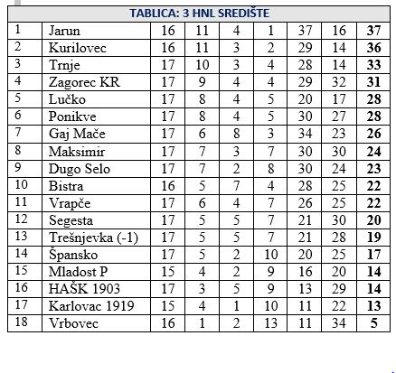 Konačno je krenulo!!!! Proljetni start u 3. HNL središte odlično su odradila oba zagorska predstavnika i Zagorec iz Krapine i Gaj iz Mača. U utakmicama 17. kola Zagorec je na svom igralištu pobijedio Vrapče sa 2:0. dok je Gaj u gostima slavio kod HAŠK-a 1903 sa 1:0. I dok je Zagorec sve riješio u prvih 45 minuta, Gaj je do pobjede stigao u samoj završnici. Zagorec je u vodstvo već u 3. minuti doveo igrač gostiju Ante Bakmaz koji je pogodio vlastitu mrežu. U 45. minuti na 2:0 povisio je Matija Smrekar, a to se pokazao i kao konačan rezultat. Sva tri boda Gaju kod HAŠK-a donio je Tomas Vukadin golom u 87. minuti. Danas je odigrano 8 od 9 utakmica 17. kola. U derbiju Kurilovec je slavio kod Ponikvi 2:1, dok je istim rezultatom vodeći Jarun pobijedio zadnji Vrbovec. Također sa 2:1 Trnje je slavilo kod Španskog, Maksimir je sa 4:2 pobijedio Mladost iz Petrinje, Trešnjevka je sa 1:0 bila bolja od Dugog Sela, dok je Lučko u Sisku svladalo Segestu sa 3:1. Sutra će igrati Bistra i Karlovac 1919. Nakon 17. kola vodi Jarun sa 37 bodova, bod manje ima Kurilovec, s tim da obje ekipe imaju utakmicu manje. Zagorec se popeo ovom pobjedom za jedno mjesto i sada je 4. sa 31. bodom, dok je Gaj ostao na 7. mjestu, sada sa 26 bodova. Zagorec će u 18. kolu u derbiju dočekati vodeći Jarun, dok će Gaj biti domaćin Lučkom.