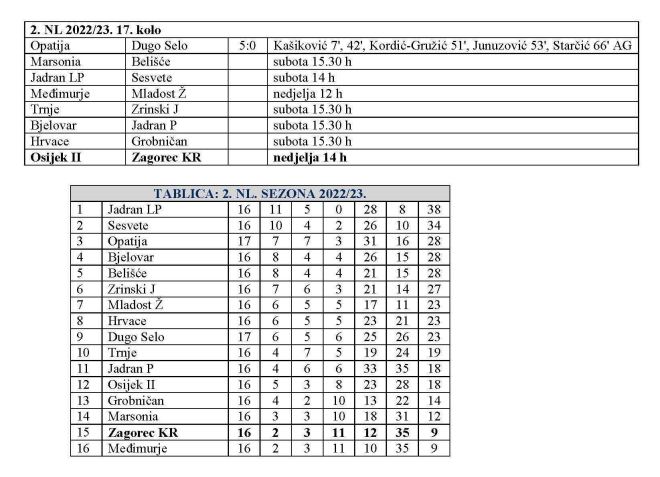 Većina utakmica 17. kola igra se danas, a Zagorec iz Krapine na teren će sutra i to od 14 sati, kada će gostovati kod Osijeka II. Nakon poraza na startu proljeća, sa ovog gostovanja Zagorec se nada boljem rezultatu.
