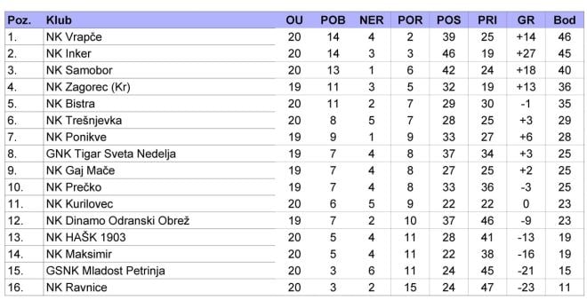 Ovog vikenda odigrano je pet od osam utakmica III. NL-centar. Zbog loših vremenskih prilika odgođene su utakmice Zagorec KR – Dinamo OO, Gaj Mače – Ponikve i Tigar SN – Prečko. Zagorec će već večeras u 19 sati odigrati svoju utakmicu, a Gaj Mače 13. svibnja.