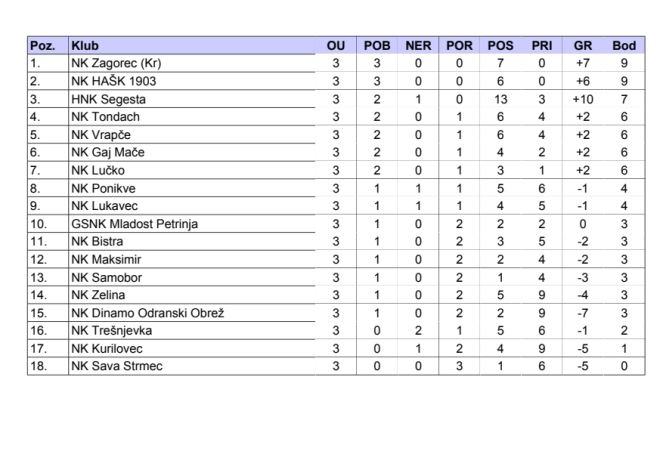 Jedan, ali vrijedan pogodak Christiana u Bistru ostavio je Zagorec KR na čelu ljestvice sa stopostotnim učinkom. U derbiju kola HAŠK je slavio protiv Gaja s 2:0 i tako uz Zagorec KR ostao jedina momčad nakon tri kola sa stopostotnim učinkom. Uz ovaj dvojac neporažena je i Segesta koja je u ovom kolu uzela samo bod kod Lukavca. Sjajan posao napravio je Tondach koji je kod Kurilovca gubio s 2:0, a onda preokrenuo na 2:4 i sada drži visoku četvrtu poziciju. Nakon dva uvodna poraza Zelina je stigla do prve pobjede protiv Dinama OO i tako "fenjer" prepustila Savi Strmec koja je vodila s 1:0 protiv Vrapča, ali Vrapče je na kraju preokrenulo u 1:2. Jedan pogodak bio je dovoljan Samobor za prva tri boda protiv Maksimira, a isto tako s jednim pogotkom u gostima kod Trešnjevke Lučko je došlo do sva tri boda i druge pobjede. Prvu pobjedu ostvarila je Mladost protiv Ponikvi.