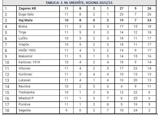 Jučer su odigrane preostale dvije utakmice 11. kola 3. HNL središte. Gaj Mače je poražen kod Bistre. Domaćine je u vodstvo doveo Grozdek s 11 metara u 8. minuti, ali je Josipović u 45. poravnao. No, u 81. minuti za sva tri boda domaćina zabija Matošević. U drugoj jučerašnjoj utakmici Trnje i Vrapče odigrali su bez golova. Tako je nakon kompletiranog 11. kola na čelu opet Zagorec s 26 bodova, koliko ima i Dugo Selu, a slijedi Gaj s 24 boda, ali i utakmicom manje, koju će već ove srijede nadoknaditi kod zadnje Segeste. Ova se trojka malo i odvojila na ljestvici, jer Bistra i Trnje imaju po 18 bodova. U 12. pak kolu veliki derbi je u Maču gdje Gaj dočekuje Dugo Selo, dok će Zagorec u goste kod Ravnica.