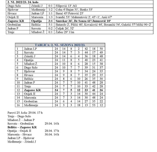 Zagorec je u vrlo važnoj utakmici za njegov ostanak u ligi izborio novu pobjedu i šesti susret u nizu bez poraza. Opatija je bolje otvorila susret i povela u 10 minuti preko Junuzovića da bi od 20. minute u igri dominirao Zagorec što je realizirano sa dva lijepa pogotka – najprije Smrekara za izjednačenje a potom Christiana za konačnu pobjedu.
