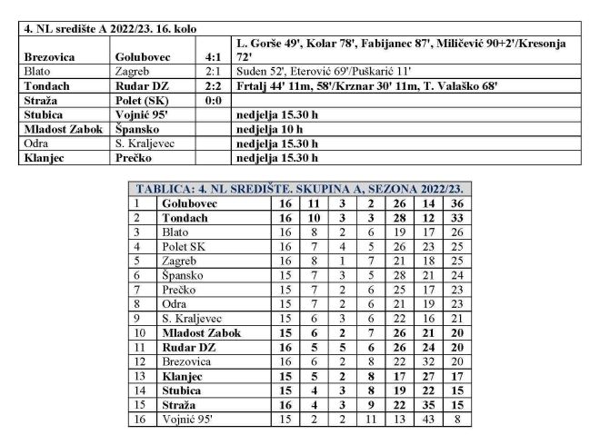 Krenuo je proljetni dio sezone u 4. NL središte skupina A. Četiri su utakmice 16. kola odigrane danas, a četiri se igraju sutra. U zagorskom derbiju Tondach i Rudar DZ odigrali su 2:2. Vodeći Golubovec nije startao dobro u proljeće, te je poražen kod Brezovice 1:4. Straža je došla do boda, nakon 0:0 protiv Poleta (SK). Sutra će se tri utakmice igrati u Zagorju. Mladost Zabok u 10 sati dočekuje Špansko, a u 15.30 Stubica dočekuje Vojnić '95', a Klanjec Prečko.