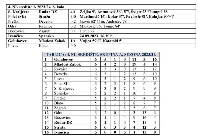 Danas je odigrano još pet utakmica 6. kola 4. NL središta skupina A. Odigran je i najveći derbi, kako zagorski, tako i cijele lige. U Novom Golubovcu sastale su se dvije vodeće ekipe, još bez poraza, Golubovec i Mladost Zabok. Svakome je pripalo po poluvrijeme, na kraju 1:1, pa i dalje i jedni i drugi drže dvije vodeće pozicije. Dvije zagorske ekipe danas su gostovale, ali nije dobro završilo. Sesvetski Kraljevec je sa 4:1 svladao Rudar DZ, dok je Polet (SK) sa 4:0 pobijedio Stražu. Sutra će kolo zatvoriti Ivančica domaćom utakmicom protiv Španskog u 16.30 sati. Prije podne igraju Ilovac i Blato. U preostalim današnjim utakmicama pobjede gostiju, Zagreba kod Brezovice 1:0 i Ravnica kod Odre 2:0. Ravnice su i prvi pratitelj zagorske dvoje, također bez poraza do sada.