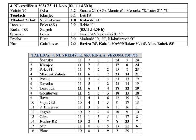 Odigrano je još šest utakmica 11. kola 4. NL središte skupina A. Veliki zagorski derbi odigrali su Tondach i Klanjec. Bilo je zanimljivo, svoje šanse imao je i Tondach, ali Klanjec je u dijelu sezone kad mu sve ide, samopouzdanje je na vrhu, momčad je posložena od prvog do zadnjeg detalja i rezultat je tu. Zabio je Marko Leš za pobjedu kojom se Klanjec izjednačio na vrhu sa Španskom.