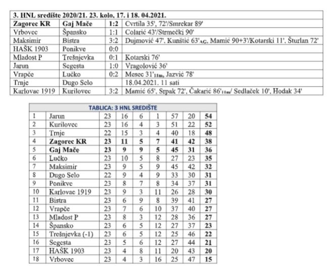 Danas je odigrano 8 od 9 utakmica 23. kola treće HNL središte. Ovo nam je kolo ponudilo i veliki zagorski derbi. Naime, u Krapini je Zagorec dočekao Gaj iz Mača. Derbi je opravdao očekivanja, a Gaj je u Mače odnio sva tri boda. Cvrtila je u 35. minuti pogodio za 0:1 i tim se rezultatom otišlo na odmor. U nastavku, u 75. minuti Cvrtila je postao junak zagorskog derbija i drugim golom riješio pitanje pobjednika. U samoj završnici, u 89. minuti, Smrekar je postigao gol za 1:2, no za potpuni preokret nije bilo vremena. Uz ovu utakmicu dogodilo se veliko iznenađenje. Karlovac je 0:2 pretvorio u 3:2 protiv Kurilovca, koji je tako izgubio vodstvo, jer je Jarun sa 1:0 pobijedio Segestu i preuzeo 1. mjesto. Zagorec je ostao 4. s 38 bodova, a Gaj 5., ali sada s 36 bodova. Sutra preostaje još jedna utakmica, u 11 sati u Trnje dočekuje Dugo Selo. Donosimo rezultate, ljestvicu i strijelce, i fotke sa zagorskog derbija.