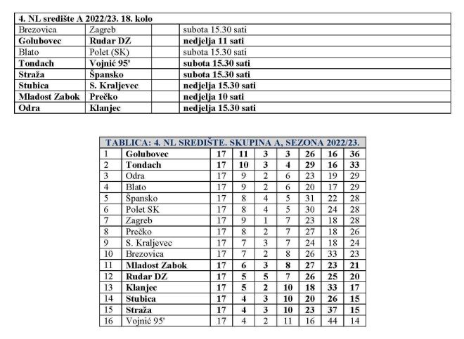 Nimalo dobro nije krenuo proljetni dio 4. NL središte skupina A, za zagorske klubove. U prva dva nastupa niti jedna pobjeda, a u prošlom kolu niti jedan bod. Ovaj drugi loš podatak ne može se ponoviti u 18. kolu jer je na rasporedu jedan zagorski derbi. Naime, sutra će u 11 sati igrati Golubovec i Rudar DZ. No, zagorskim se pobjedama nadamo već danas. U 15.30 Tondach će dočekati zadnji Vojnić '95, a Straža u isto vrijeme Špansko. Preostala tri kluba iz Zagorja na teren će sutra. Već u 10 sati Mladost će u Zaboku dočekati Prečko, Stubica je u 15.30 sati domaćin Sesvetskom Kraljevcu, a Klanjec će u isto vrijeme gostovati kod Odre.