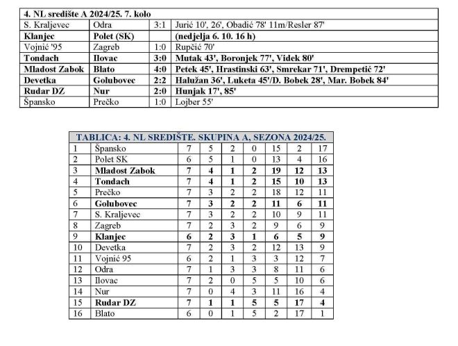 Tako je Mladost Zabok pobijedila Blato 4:0, Tondach je bio bolji od Ilovca 3:0, a do prve pobjede stigao je Rudar DZ, 2:0 protiv Nura. Golubovec je jedini od zagorskih predstavnika gostovao i odigrao je 2:2 kod Devetke. Kolo će sutra završiti Klanjec, koji dočekuje Polet (SK), koji je do ovog kola bio vodeći, a danas ga je prestiglo Špansko nakon pobjede u derbiju 1:0 protiv Prečkog. Mladost i Tondach drže treće i četvrto mjesto sa po 13 bodova, Golubovec je šesti sa 11, Klanjec je na devetom mjestu sa devet bodova i naravno utakmicom manje, a Rudar DZ se pomaknuo na 15. mjesto sa četiri boda.