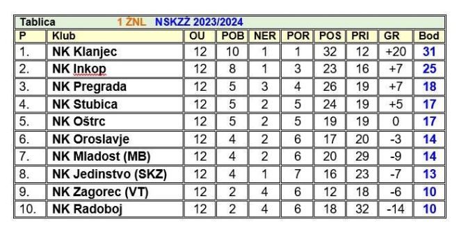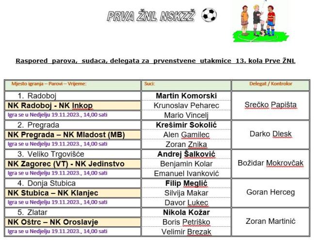 Pred nama je 13. kolo 1. zagorske nogometne lige, posljednje ove jeseni. Jesenski prvak Klanjec u zadnjem nastupu pred pauzu će na zanimljivo gostovanje kod Stubice. Inkop će na gostovanje kod Radoboja, kojem je za opstanak potreban svaki bod, a zanimljivo će biti i u ogledu Zagorca VT i Jedinstva. Pregrada će jesenski dio pokušati završiti pobjedom protiv Mladosti MB, dok će u Zlataru igrati Oštrc i Oroslavje. Utakmice se igraju danas s početkom u 14 sati. Evo trenutne tablice i parova, uz suce i delegate.