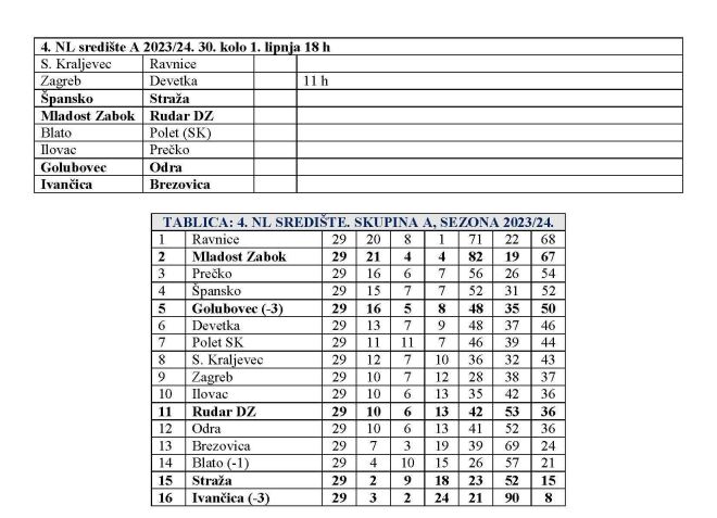 Pred nama je 30. kolo 4. NL središte Skupina A. Riječ je o zadnjem kolu, koje će donijeti rješenje pitanja o prvaku. U konkurenciji je Mladost iz Zaboka, ali ne ovisi sama o sebi. Naime, u zadnje kolo Mladost ulazi sa bodom zaostatka za Ravnicama. Ravnice su te koje imaju sve u svojim rukama, ili bolje napisati nogama, ali da će im biti lako, neće. Osim pritiska koji je sasvim normalan i logičan, kad je u pitanju onaj zadnji korak ka osvajanju naslova, tu je i činjenica da je pred Ravnicama teško gostovanje, kod Sesvetskog Kraljevca. Mladost pak ima u zadnjem kolu zagorski i zabočki derbi protiv Rudara DZ. U utakmicu ulazi sigurno kao veći favorit, nego Ravnice u svojoj utakmici. Na Zabočanima je da svoju utakmicu dobije, ali uz to morat će osluškivati rezultat Ravnica. Ostale zagorske ekipe danas jednostavno završavaju sezonu, lišene rezultatskog naboja. Osim zagorskog derbija, Golubovec će sezonu završiti domaćom utakmicom protiv Odre. Straža će pak gostovati kod Španskog, a Ivančica za oproštaj od lige dočekuje Brezovicu. Sve se utakmice igraju danas, Zagreb – Devetka u 11 sati, a ostale u 18 sati.