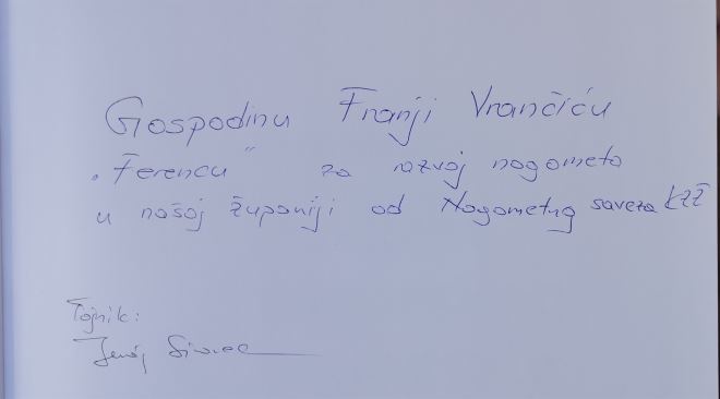 Iskreno dirnut Franjo Vrančić – Ferenc rekao je: „ Željko, stvarno si odabrao savršen poklon za mene. Hvala NS KZŽ koji mi je poklonio knjigu koja me podsjeća na moje mlade dane te tebi na dresu jer to je odjeća koju s radošću nosim i danas. Zaista ne znam na koji način da se zahvalim na poklonima jer osjećam se tako posebno i mogu samo kazati – hvala i stvarno ste odabrali savršen poklon za mene“.