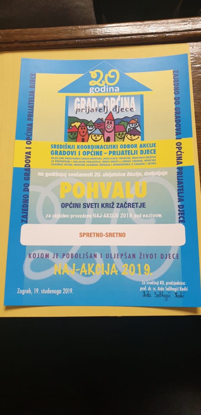 U organizaciji Saveza društva „Naša djeca“ Hrvatske prošlog utorka obilježeno je 20 godina akcije Gradovi i općine -prijatelji djece te su dodijeljene Povelje i Pohvale gradovima i općinama za ukupno 56 prijavljenih Naj-akcija u 2019. kojima su gradovi i općine uljepšali dječju svakodnevnicu. Tom prigodom Općini Sveti Križ Začretje dodijeljena je Pohvala za ovogodišnju Naj akciju zvučnog naziva “Spretno-sretno”, u sklopu koje je otvoren Poligon spretnosti s različitim igrama oslikanima na atletskoj stazi u dužini 100 metara te je ispred Osnovne škole Sv. Križ Začretje oslikano šahovsko polje kako bi djeca dok čekaju autobus mogla zaigrati igru šaha. Primili su je predsjednica DND-a Sveti Križ Začretje Nevenka Sinković, član Koordinacijskog odbora Općine Sveti Križ Začretje Franjo Kučko, te dječja načelnica Tihana Vorih i njezin zamjenik Gabriel Jurman.