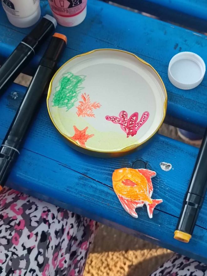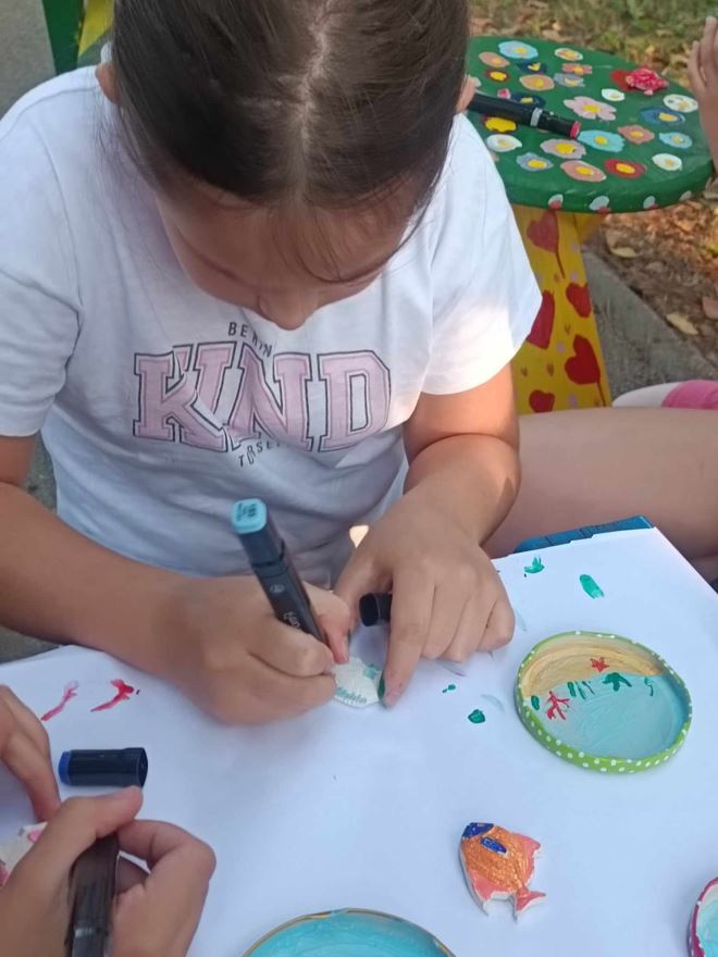 Veseli žamor i smijeh tridesetak mališana ispunio je prostor parka škole u četvrtak, 25. 7. na osmoj srpanjskoj radionici. Djeca su male gipsane ribice bojila ali i ukrašavala motivima mora ili podmorja prostor u koji će ih zalijepiti / poklopac s magnetom/.