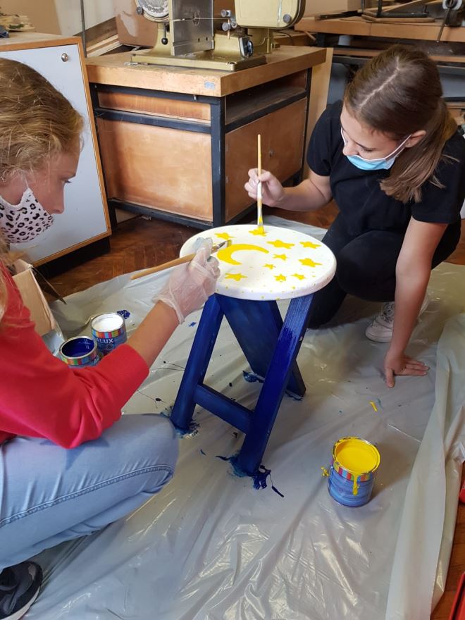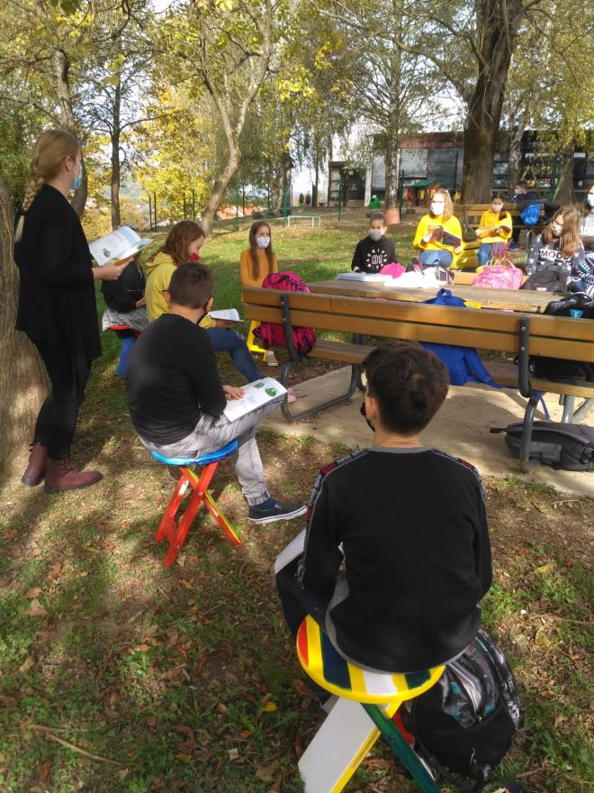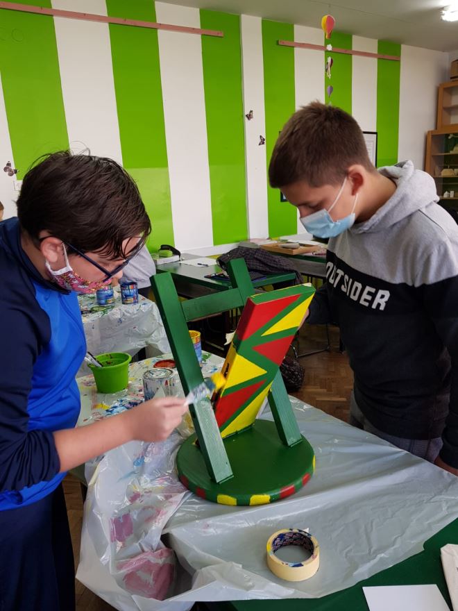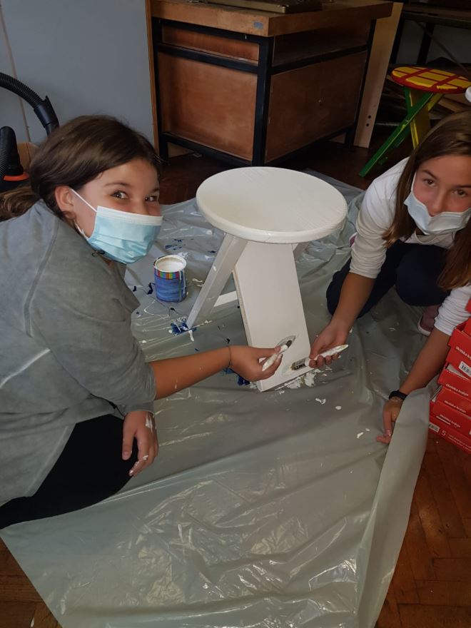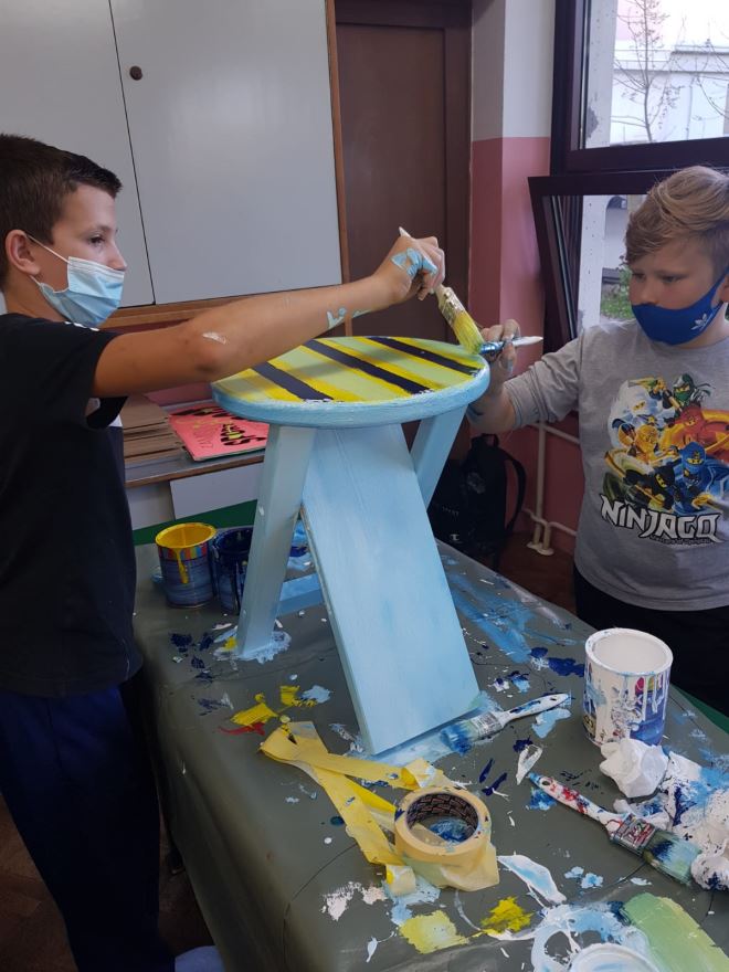 Prijedlog je da se nabave čvrste, ali lako prenosive stolice. . U akciji sudjeluju svi učenici predmetne nastave koji na satovima tehničke kulture vodootpornim bojama boje „stolčeke“. Svaki razredni odjel boji dva „stolčeka“, jedan djevojčice a drugi dječaci. Izbor motiva je po želji djece i međusobnom dogovoru. Tako smo dobili 22 vesela „stolčeka“ i možemo ih koristiti za nastavu na otvorenom. Djeca se vesele učionici na otvorenom koja je u petak, 23. 10. 2020. zahvaljujući lijepom sunčanom danu i proradila.