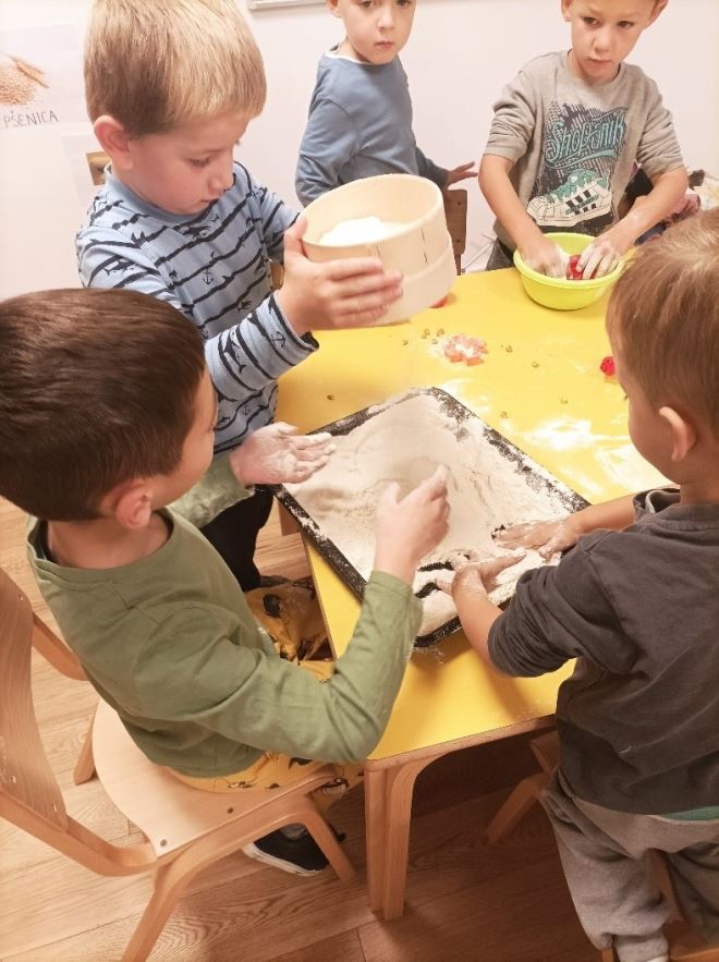 Zahvaljujući suradnji sa roditeljima, prikupili su različite vrste brašna, sjemenki i žitarica kojima su djeca samostalno manipulirala i istraživala.