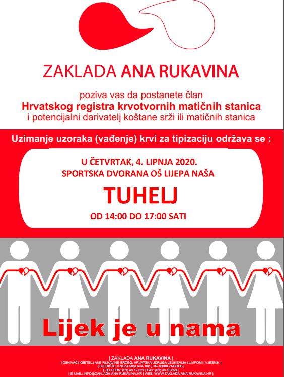 Akcija upisa u Hrvatski registar dobrovoljnih darivatelja krvotvornih matičnih stanica održat će se u četvrtak, 4. lipnja od 14,00 do 17,00 sati u školskoj dvorani Osnovne škole Lijepa naša u Tuhlju. Ova akcija provodi se u suradnji sa Zakladom Ana Rukavina kako bi zajedno pomogli oboljelim osobama u potrazi za podudarnim darivateljem na inicijativu OŠ Lijepa naša, Općine Tuhelj i DND Tuhelj. Uzorak krvi za upis u Hrvatski registar dobrovoljnih darivatelja krvotvornih matičnih stanica ne može se dati samo za Luciju već se upisom u Hrvatski registar dajete na raspolaganje oboljelim osobama diljem svijeta. Svi zdravi građani od 18 do 40 godina starosti mogu dati uzorak krvi i upisati u Hrvatski registar. Proces upisa obuhvaća popunjavanje pristupnice i zdravstvenog upitnika te davanje uzorka krvi za HLA tipizaciju kojim se utvrđuju antigeni tkivne snošljivosti. Upis u Hrvatski registar prvi je korak koji je potrebno ispuniti kako bi se pomoglo teško oboljelima od akutnog i kroničnog oblika leukemije te bolesnika s teškim oštećenjem koštane srži diljem svijeta. Prilikom upisivanja, a prema uputama Hrvatskog zavoda za javno zdravstvo, apeliramo na građane da drže razmak od 1.5 do 2 metra, da se koriste dezinficijensima koje ćemo osigurati na ulazu u prostoriju gdje će se upisivati u Hrvatski registar te da ukoliko imaju bilo kakve simptome poput respiratornih problema/infekcija, povišene tjelesne temperature i sl. da zbog sigurnosti svih ostalih, propuste ovu akciju. Informacije o tome gdje se, osim na ovoj akciji, mogu upisati u jednom od 8 transfuzijskih centara u Republici Hrvatskoj mogu pronaći na sljedećoj poveznici: https://zaklada-ana-rukavina.hr/transfuzijski-centri/.