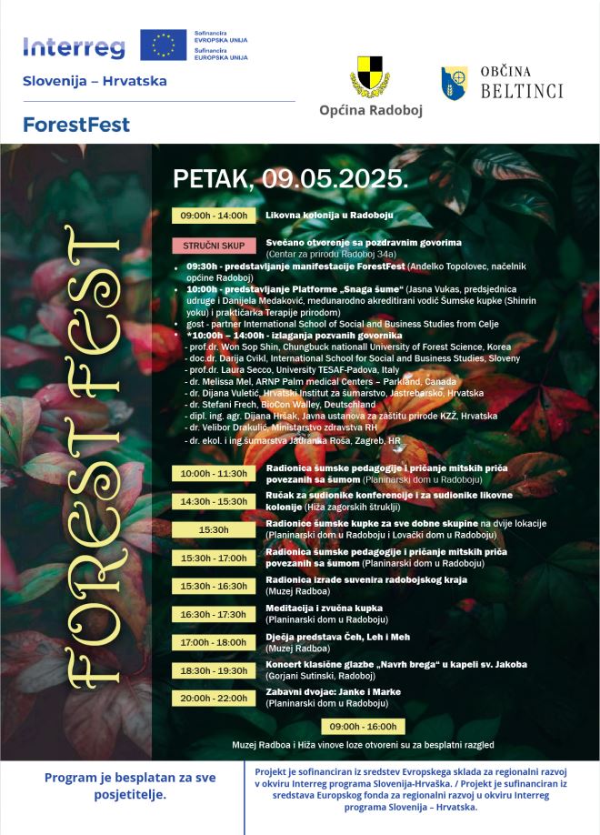 Tijekom tri dana manifestacije organizatori su pripremili izuzetno bogat program, a više je o njemu rekla Ravnateljica Muzeja Radboa, Ivana Hazulin Pospiš, istaknuvši da je najvažniji događj na rasporedu već ovog petka, stručni skup pod nazivom ‘Priroda i zdravlje’, koji će obuhvatiti teme zdravstvenog wellnessa, šumske kupke i prirodnih znanstvenih čimbenika.