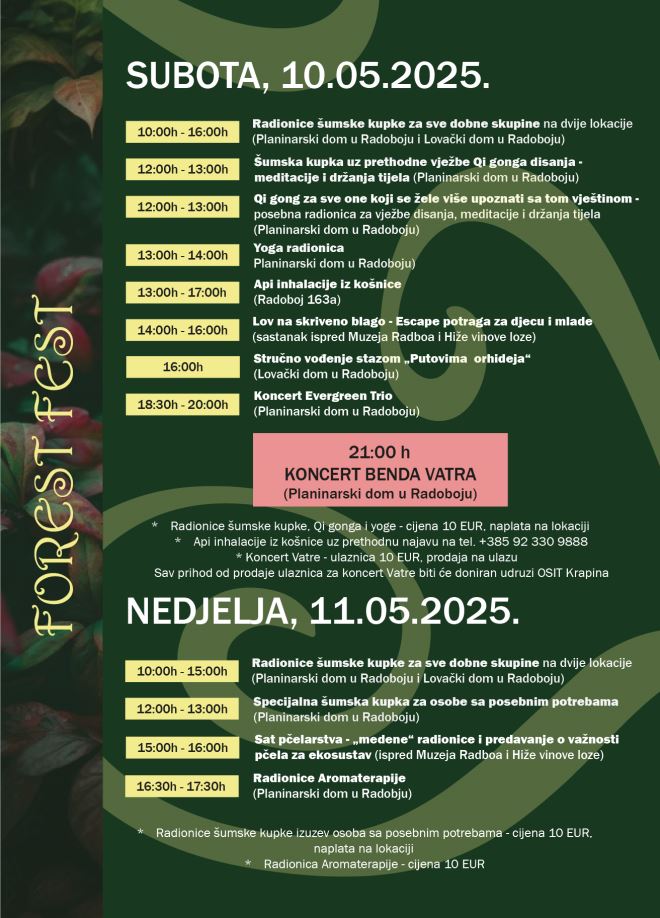 -Nakon skupa slijedi niz šumskih kupki za sve dobne skupine, program šumske pedagogije za djecu, kreativne radionice izrade promo suvenira nadahnutih prirodnim osobitostima Radoboja, meditacija i zvučna kupka, dok ćemo za najmlađe organizirati predstavu ‘Čeh, Leh i Meh’. U večernjim satima očekuje nas glazbena poslastica ‘Na vrh brega’ te zabavni dvojac Janke&Marke. Subota će također biti ispunjena šumskim kupkama za sve dobne skupine, a večer ćemo završiti uz koncert benda Vatra. Nedjeljni program uključuje radionicu specijalne šumske kupke za osobe s posebnim potrebama te zanimljivu edukaciju o pčelama i njihovoj važnosti u prirodnom ekosustavu – rekla je Hazulin Pospiš.
