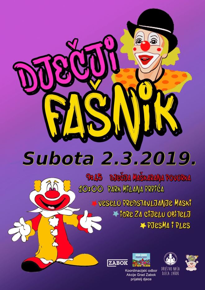 Tradicionalni dječji fašnik u organizaciji Društva Naša djeca Zabok održat će se u subotu 2. ožujka. U 9:45 će krenuti dječja maškarana povorka iz Dječjeg vrtića Zipkica prema Parku Milanu Prpića. U 10 sati počinje program uz veselo predstavljanje maski. Organizatori najavljuju kako će tu biti igre za cijelu obitelj, pjesmu i ples.