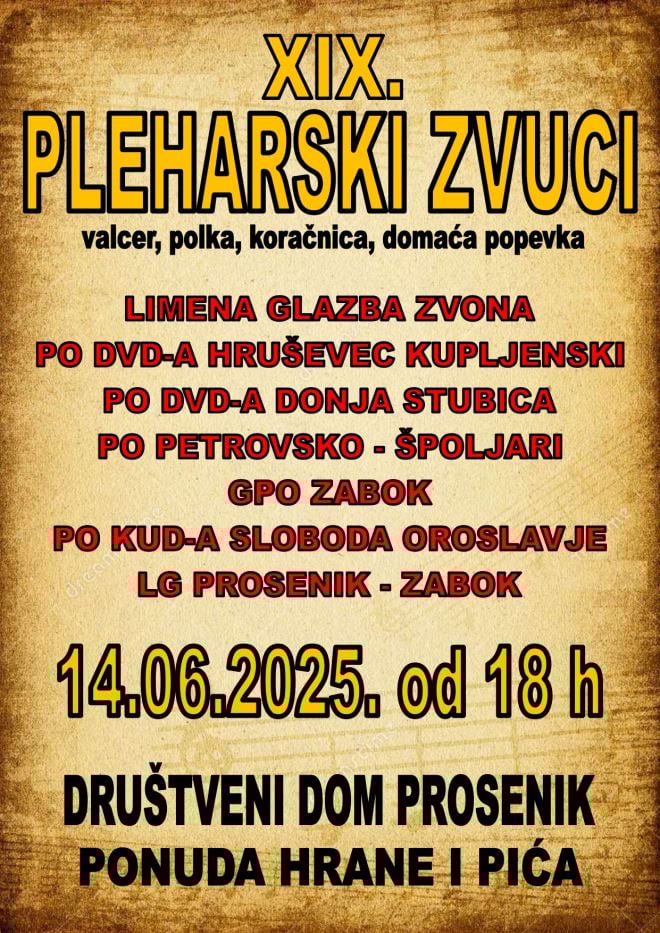 Na 19. izdanju glazbene manifestacije "Pleharski zvuci", koja će se održati u subotu, 14. lipnja, od 18 sati, u Društvenom domu Prosenik.