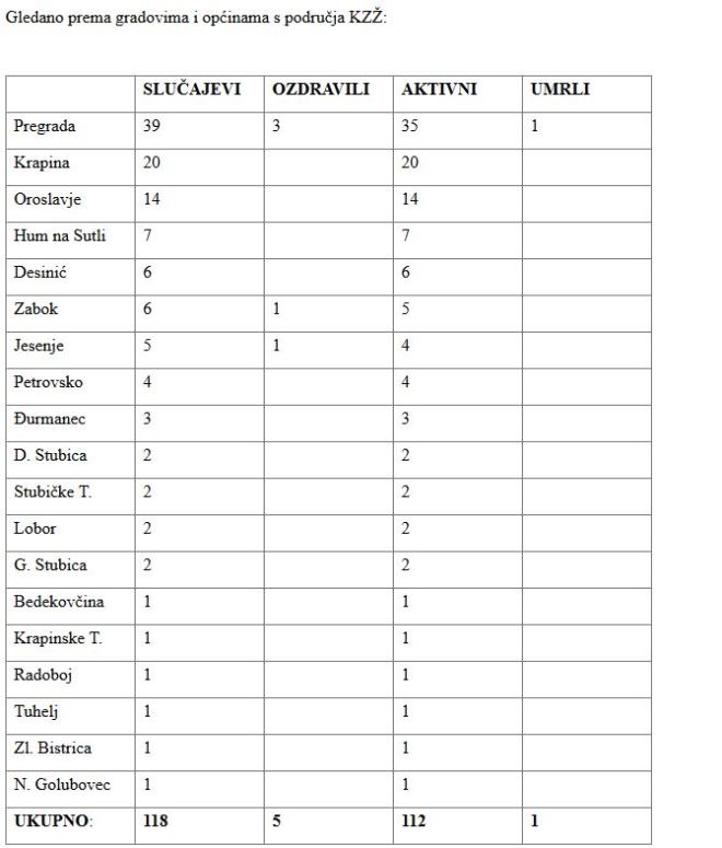 Na području Krapinsko - zagorske županije dosad je evidentirano ukupno 118 osoba pozitivnih na koronavirus sa prebivalištem na području županije.