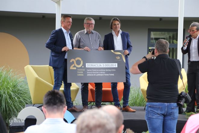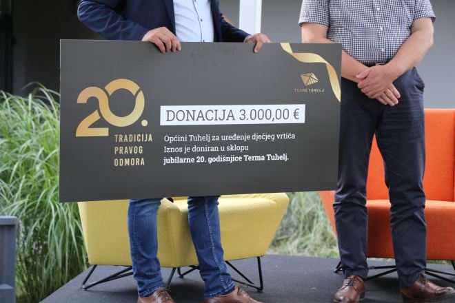 Kako su Terme Tuhelj poznate po društveno odgovornom poslovanju, no ova godina nije godina prošla bez humanitarnih akcija i donacija. –Dajemo potporu lokalnim sportašima, ostvarili smo više humanitarnih projekata, a posšto znamo da se priprema ulaganje u Dječji vrtić, odlučilo smo povodom naše 20. godišnjice dati donaciju Općini Tuhelj, koju će iskoristiti za vrtić – rekao je Čretnik.
