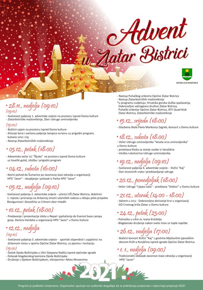 Advent u Zlatar Bistrici nastavlja se u petak adventskom večeri u organizaciji LU "Šljuka" i pod pokroviteljstvom Općine Zlatar Bistrica. Lovci pripremaju lovački gulaš, tople i hladne napitke te prigodni večernji program ispred Doma kulture od 18 sati. Noćni pohod Javorovom stazom zdravlja na redu je u subotu. Okupljanje je od 16 sati u parku HPD-a Javor odakle će se pješke krenuti do Šumarice. U nedjelju ujutro u 9.10 sati će 2. adventsku svijeću ispred Doma kulture upaliti učenici dobitnici prvih mjesta i prizanja na Državnoj smotri učeničkih radova u sklopu pilot projekta Biosigurnost i biozaštita (Dorotea Borić, Nikola Glavač, Lucian Korpar, Lovro Tuđa i Gita Vlahek) uz glazbenu pratnju Crkvenog zbora mladih.