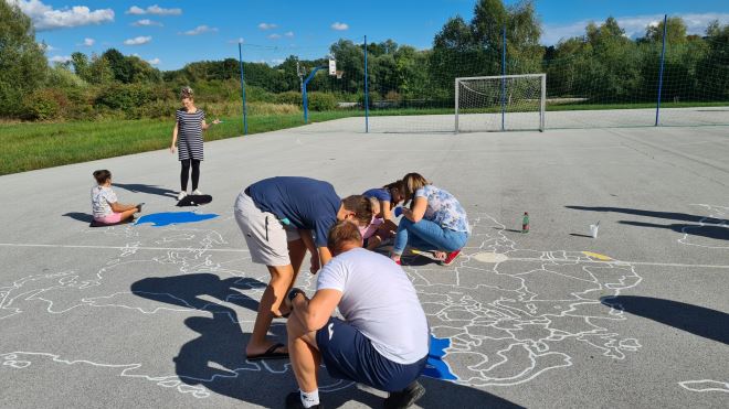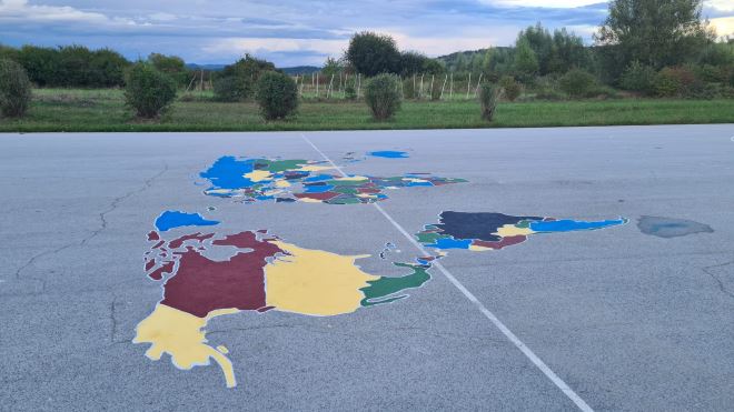 Od spomenutih financijskih resursa nabavljeni su putem interneta šablona za ocrtavanje karte svijeta, boje za beton i popratne materijale, izrađeni su plakati i zajedno sa svojim sumještanima realizirana je dugo planirana ideja da se školsko igralište ukrasi jednom kartom svijeta.