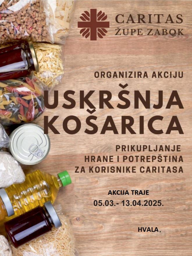 Caritas župe svete Jelene Križarice Zabok i ove godine organizira akciju „Uskršnja košarica“ kako bi uljepšati blagdan Uskrsa obiteljima slabijeg materijalnog i imovinskog statusa. Do 13.04.2025. godine košare će biti postavljene u trgovinama za pomoć najugroženijim obiteljima.