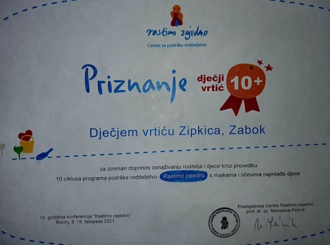 Dječji vrtić Zipkica s brojnim je aktivnostima zakoračio u jesensko vrijeme. Tako su predstavnici Dječjeg vrtića Zipkica, ravnateljica Dijana Lovinčić Crnković, psihologinja Silvija Dugorepec, logopedinja Tamara Miletić Damjanović te odgojiteljice Ankica Arl i Karmela Herčko sudjelovale se na 10. jubilarnoj konferenciji voditelja programa Rastimo zajedno u gradu Rovinju. Hvalevrijedan program za roditelje Rastimo zajedno u DV zipkica se provodi od samih početaka za što je vrtić dobio i priznanje.
