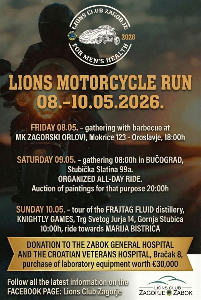 Ove godine Lions klub Zagorje organizira humanitarnu akciju motorijadu koju pod motom "Zajedno za muško zdravlje" provodi od 8. do 10. svibnja 2026., a s ciljem prikupljanja sredstava za nabavu novog uređaja za potrebe Opće bolnice Zabok i bolnice hrvatskih veterana (laboratorijskog uređaja kriostata) čija vrijednost iznosi 30.000,00 eura.