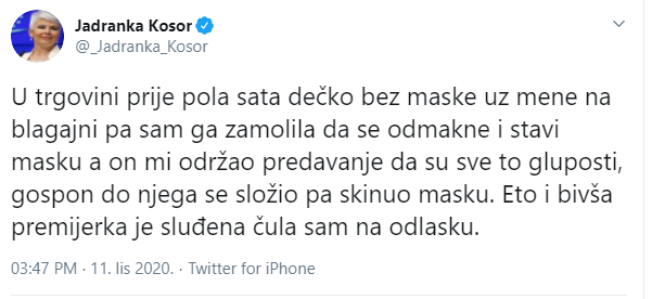 U trgovini prije pola sata dečko bez maske uz mene na blagajni pa sam ga zamolila da se odmakne i stavi masku a on mi održao predavanje da su sve to gluposti, gospon do njega se složio pa skinuo masku. Eto i bivša premijerka je sluđena čula sam na odlasku, napisala je bivša premijerka Jadranka Kosor na svom Twitter profilu.