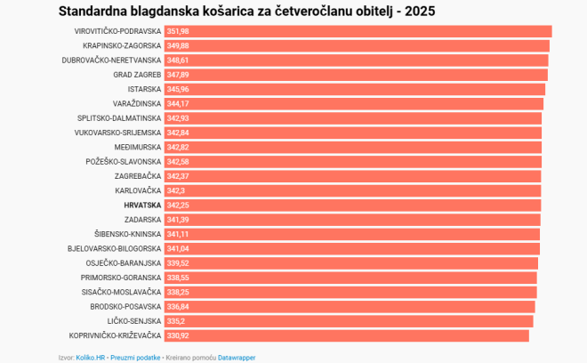 Najskuplja je Virovitičko-podravska županija s 351,98 eura, a prate ju Krapinsko-zagorska (349,88) i Dubrovačko-neretvanska županija (348,61). Ova je košarica najjeftinija u Koprivničko-križevačkoj (330,92), Ličko-senjskoj (335,2) i Brodsko-posavskoj županiji (336,84).