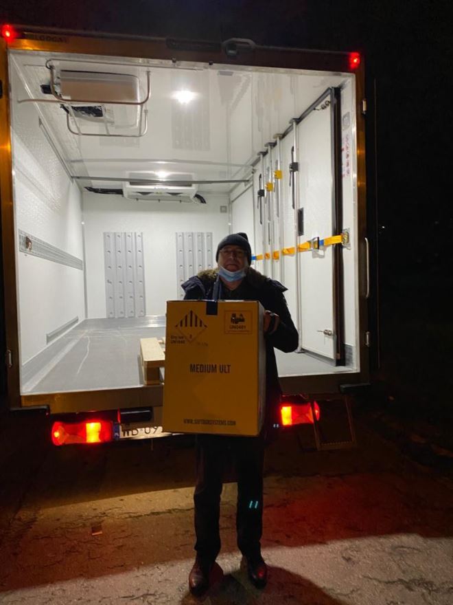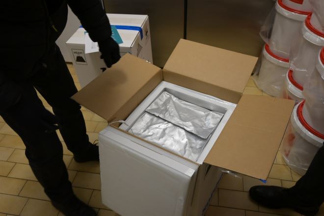 Ravnatelj Hrvatskog zavoda za javno zdravstvo, doc. Krunoslav Capak i koordinatori distribucije, dočekali su danas u 6 sati ujutro prvih 9750 doza cjepiva protiv koronavirusa tvrtke Pfizer-BioNTech. Cjepivo se mora skladištiti na temperaturi od -70 stupnjeva, a sutra, 27. prosinca, će krenuti u distribuciju po županijama.