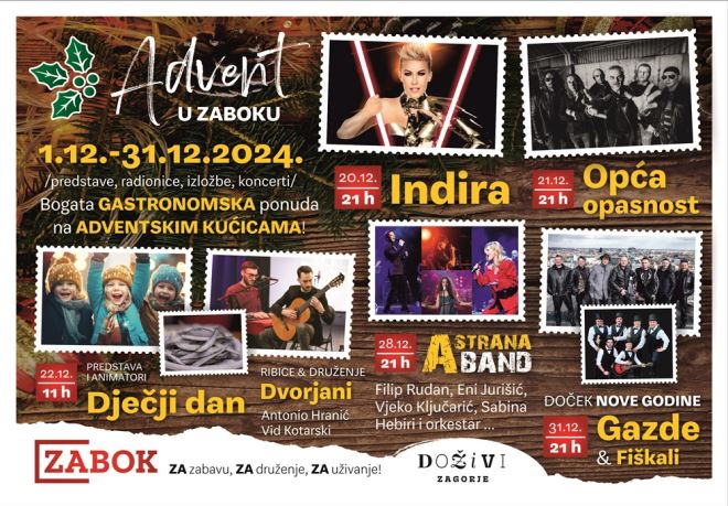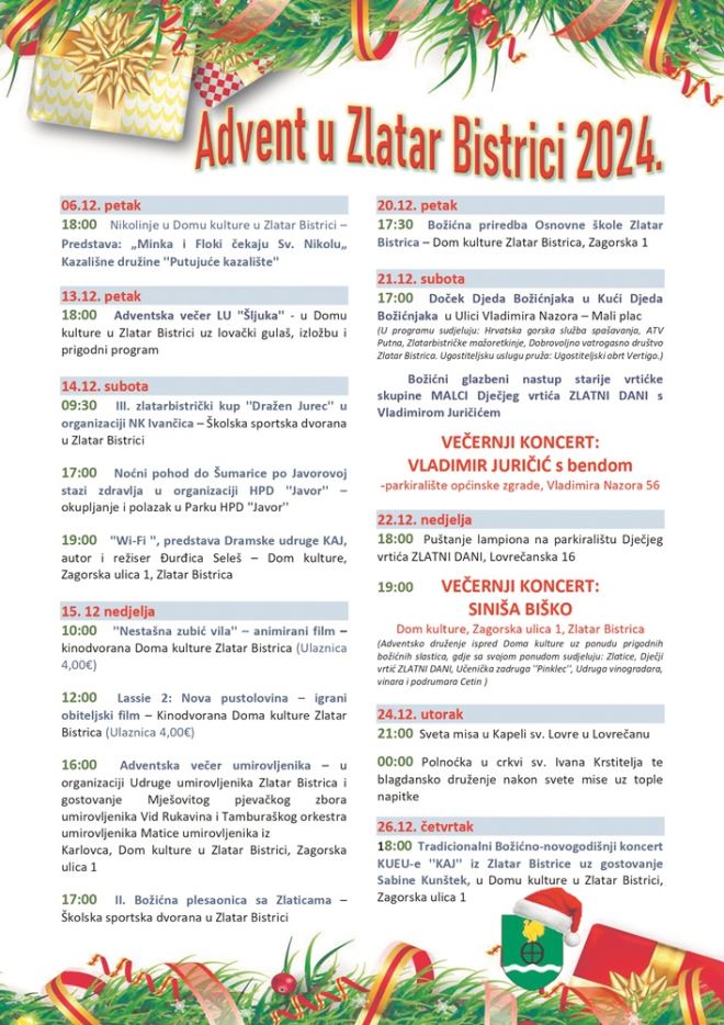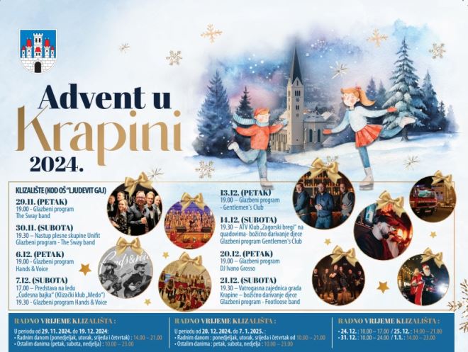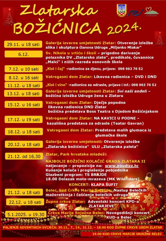 Subota, 30. studenoga, donosi predstavu za djecu u Domu kulture u 10 sati, a potom radionicu povodom Svetog Nikole u Društvenom domu u Mokricama u 16 sati. U 19 sati bit će otvorenje velike izložba Nika Titanika u Gradskog knjižnici, a navečer na trgu nastupa Tajni Gaz Balašević tribute band iz Sarajeva. U nedjelju, 1. prosinca, održat će se prva Čvarkijada u Zagorju s početkom u 12 sati. – Imamo 25 ekipa koje će se natjecati u pripremi čvaraka. Svi će dobiti 15 kilograma špeka, od kojih će, od rezanja pa do finalnog proizvoda, trebati pripremiti čvarke. Za ocjenjivanje će se pobrinuti žiri kojega čine Stjepan Kahlina, Domagoj Jakopović Ribafish te Marko Gerić, kao sponzor, ali i vlasnik jedine tvornice čvaraka u Zagorju te dobitnik svjetskih nagrada za kvalitetu čvaraka – najavio je gradonačelnik Viktor Šimunić.