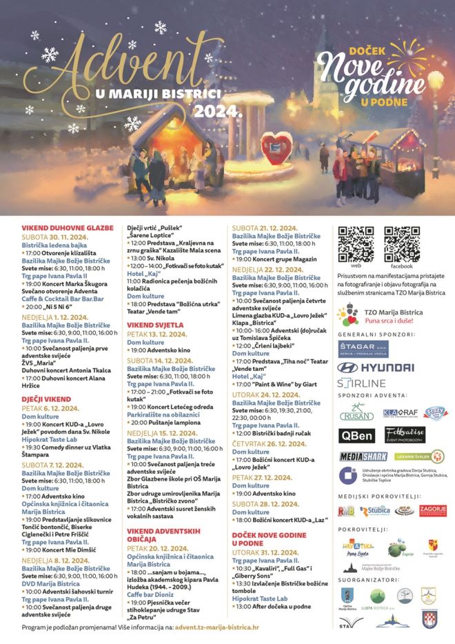 Velika manifestacija TZ Općine Marija Bistrica i Općine Marija Bistrica ''Advent u Mariji Bistrici'' ove godine donosi još bogatiji program, s brojnim novitetima i iznenađenjima koja će dodatno obogatiti vrijeme došašća i stvoriti nezaboravne trenutke za sve posjetitelje. Načelnik Općine, ujedno i predsjednik TZ Općine Marija Bistrica Josip Milički istaknuo je kako će ovogodišnji Advent nadmašiti sve dosadašnje. '- Marija Bistrica ove godine nudi program koji je raznovrstan i bogat, s vrhunskim glazbenim izvođačima, proširenim eno-gastro sadržajem i nezaboravnim doživljajem za sve posjetitelje. ''Advent u Mariji Bistrici'' već je postao jedna od najznačajnijih manifestacija na području županije. A s novim sadržajima i događanjima, ove godine postavit ćemo ljestvicu još više - rekao je Milički. Advent u Mariji Bistrici ove godine donosi niz iznenađenja na glazbenoj sceni. Svakog vikenda posjetitelje će zabavljati popularna imena hrvatske glazbene scene, uključujući Marka Škugora, Miu Dimšić, Leteći odred i Magazin. Jedan od glavnih aduta ''Adventa u Mariji Bistrici'' ove godine bit će klizalište ''Bistrička ledena bajka'', koje će i ove godine biti natkriveno, omogućujući klizanje u svako doba dana. Ovo klizalište, omiljeno među obiteljima, bit će prava atrakcija za najmlađe, ali i odrasle koji žele uživati u zimskoj zabavi. Kao i prethodnih godina, posjetitelji će imati priliku uživati u spektakularnom Dočeku u podne. Uz bogat glazbeni program te Bistričku božićnu tombolu Marija Bistrica postaje mjesto gdje zajedništvo i veselje ne prestaju. Stoga iz TZ Općine Marija Bistrica pozivaju sve da dožive pravu blagdansku čaroliju koja spaja duhovnost, tradiciju, zabavu i obiteljski ugođaj.